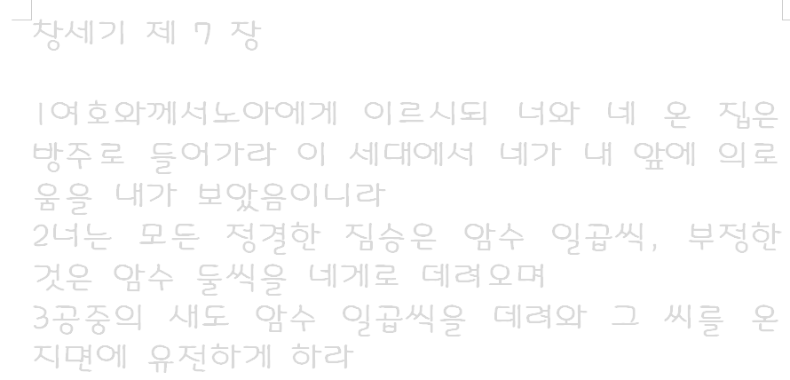 4 지금부터 칠 일이면 내가 사십 주야를 땅에 비를 내려 내가 지은 모든 생물을 지면에서 쓸어버리리라